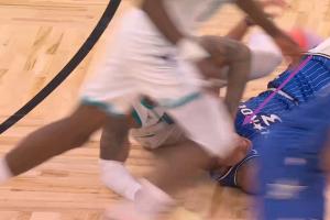GIF-小桥跟贝恩倒地了,小桥有锁喉和按人的动作,被吹技术犯规!